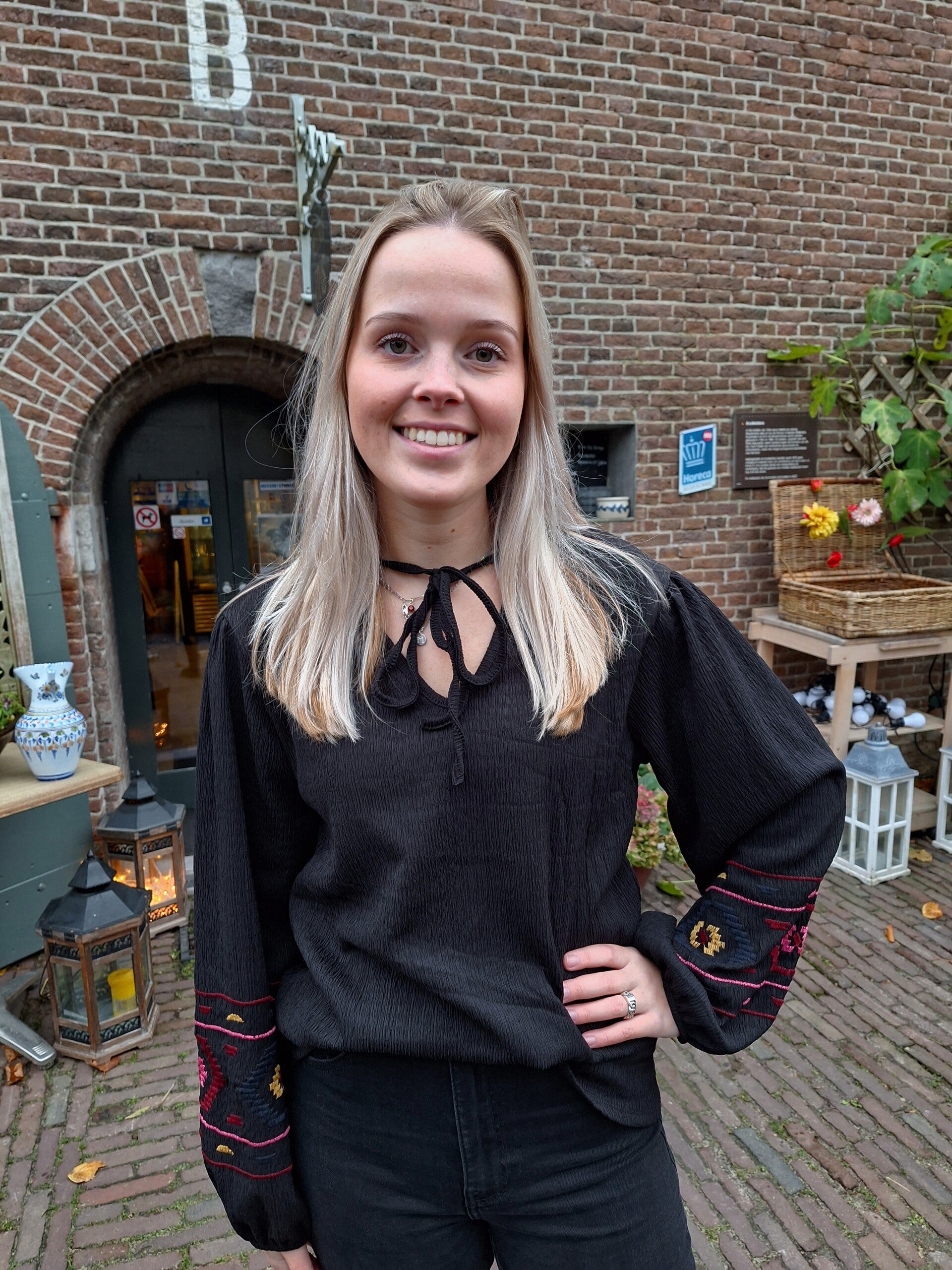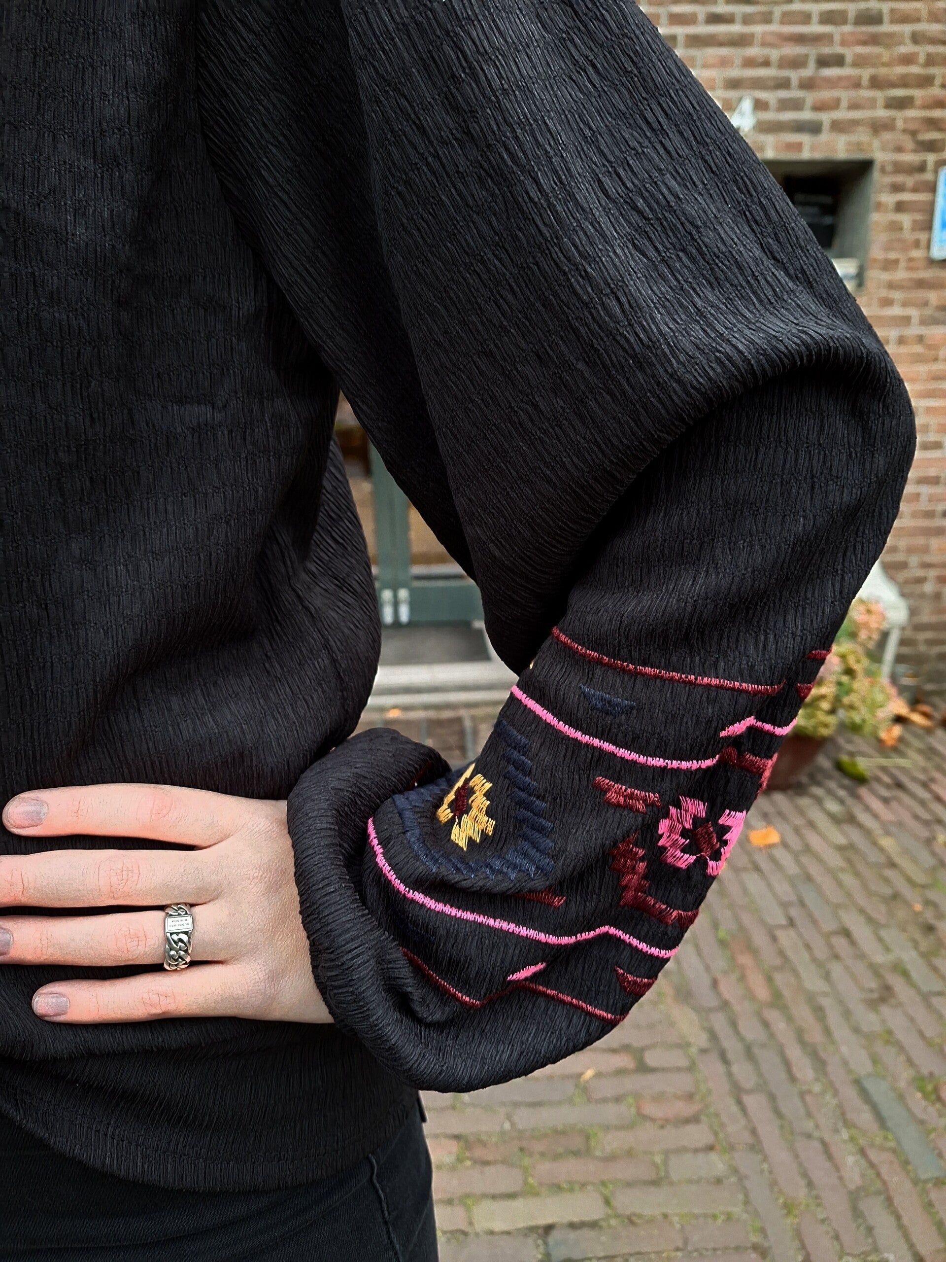Blouse met geborduursels op de mouwen. De mouwen zijn aan de onderkant van elastiek waardoor hij leuk poft. Aan de bovenkant zit een touwtje en de stof heeft een structuur