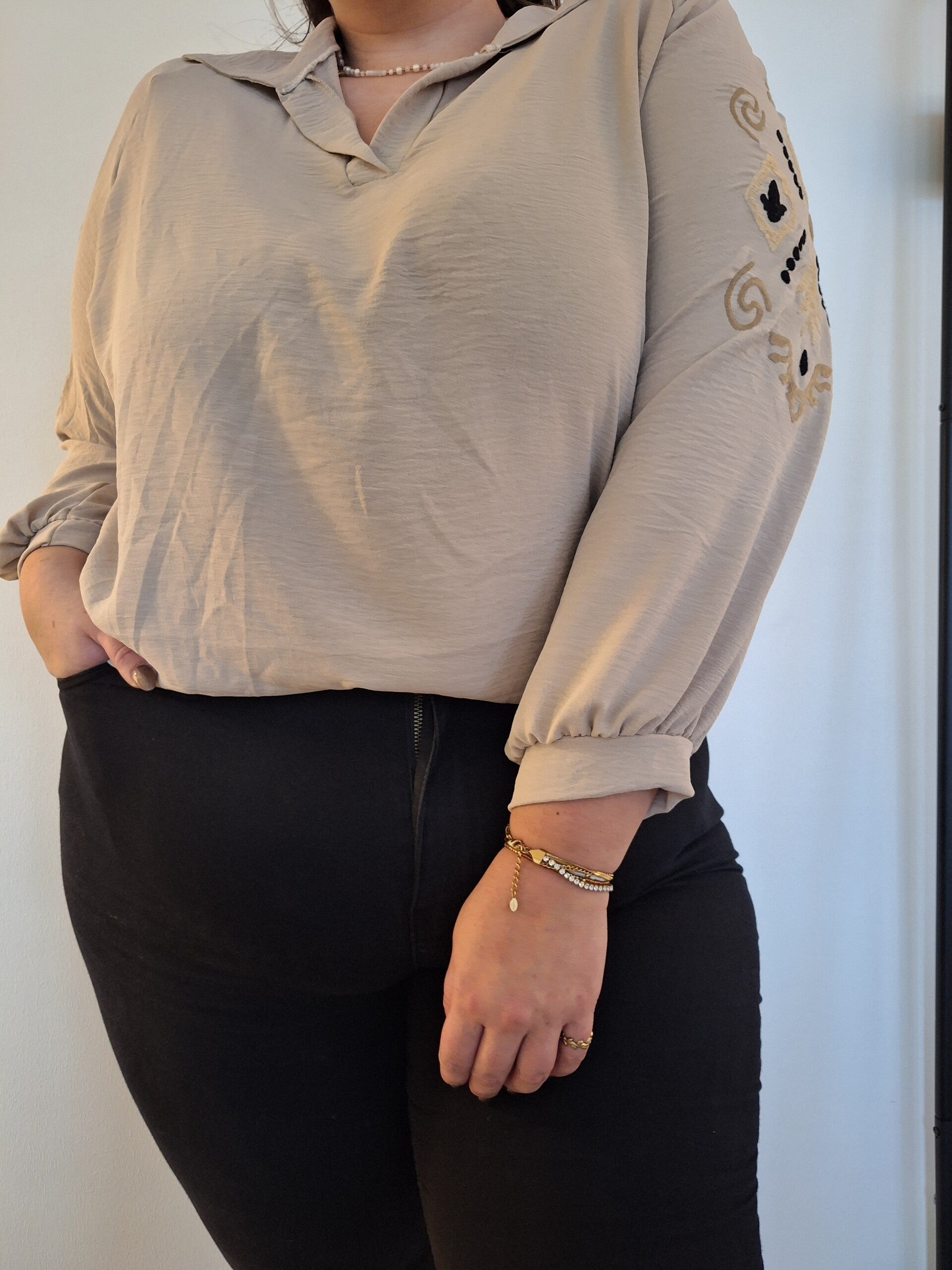 Stoere blouse met borduusels op de mouwen en een kraagje. Tof om te combineren met een leren gilet.