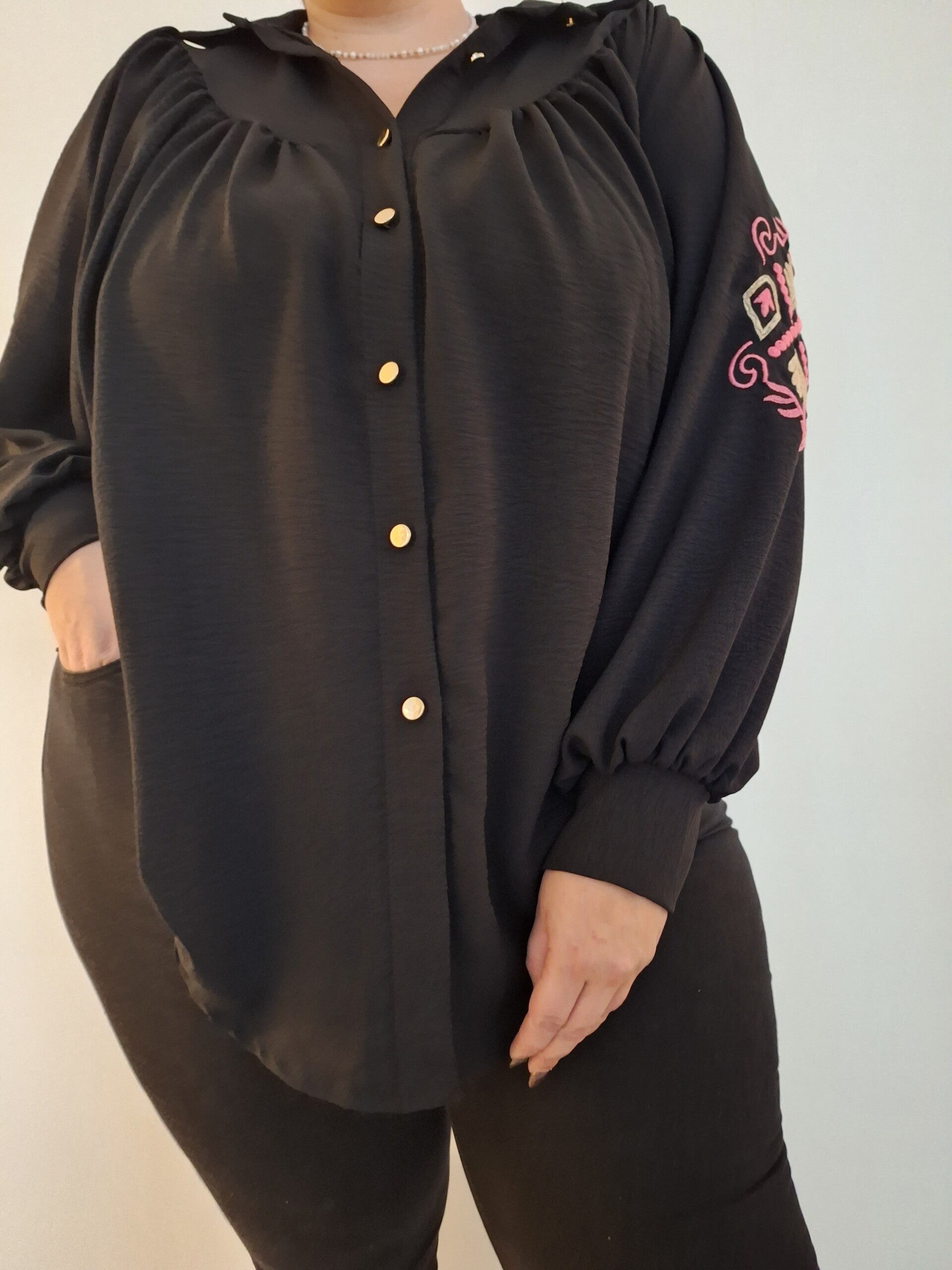 Gave, ruimvallende blouse met te gekke borduursels op de mouwen.