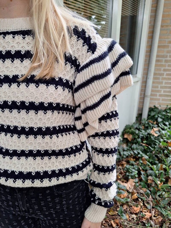 GESTREEPT TRUITJE MET ROEZELS - ECRU/MARINE