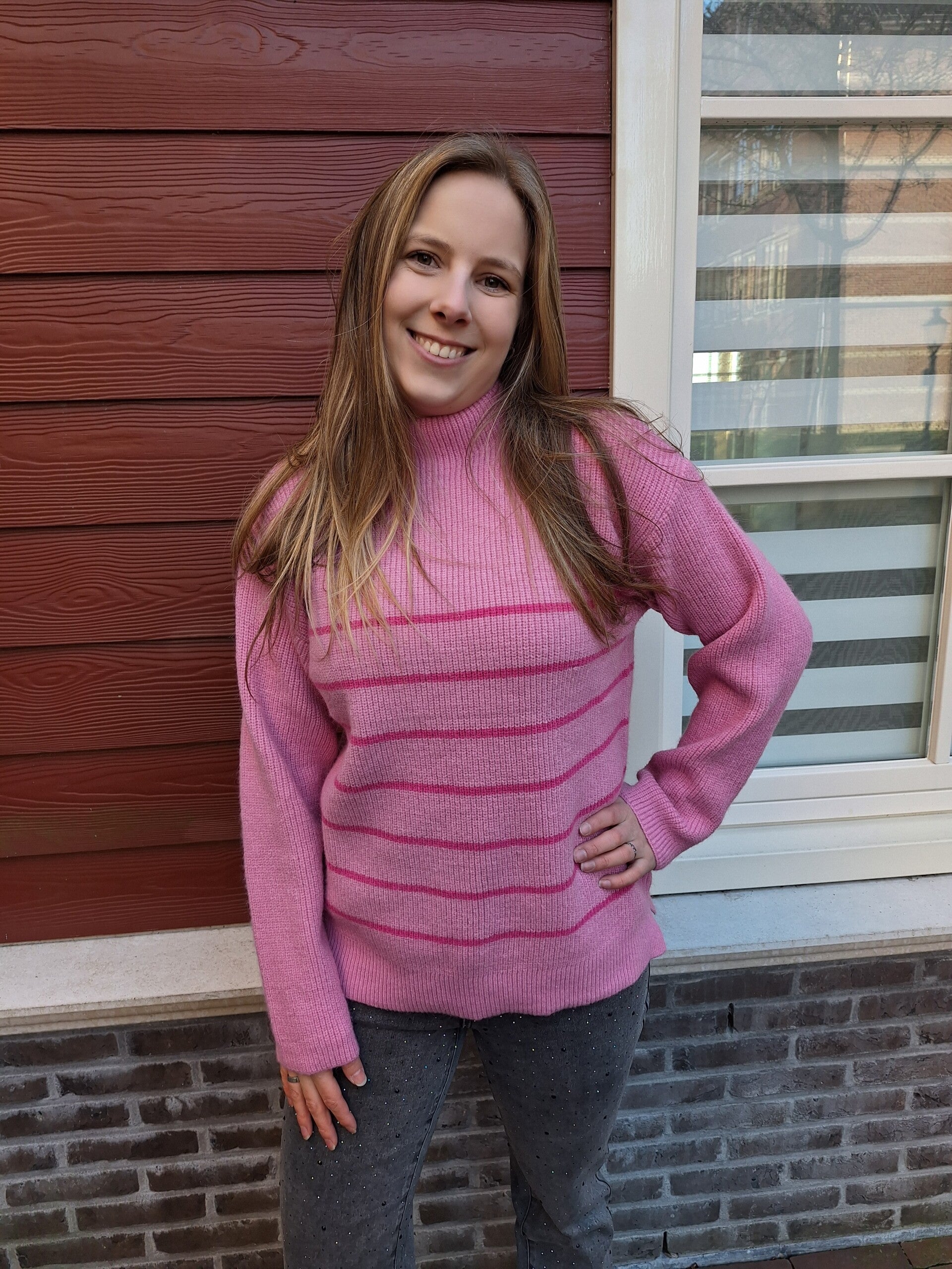 Ruimvallend truitje met streepjes. Valt wat langer en heeft leuke splitjes.