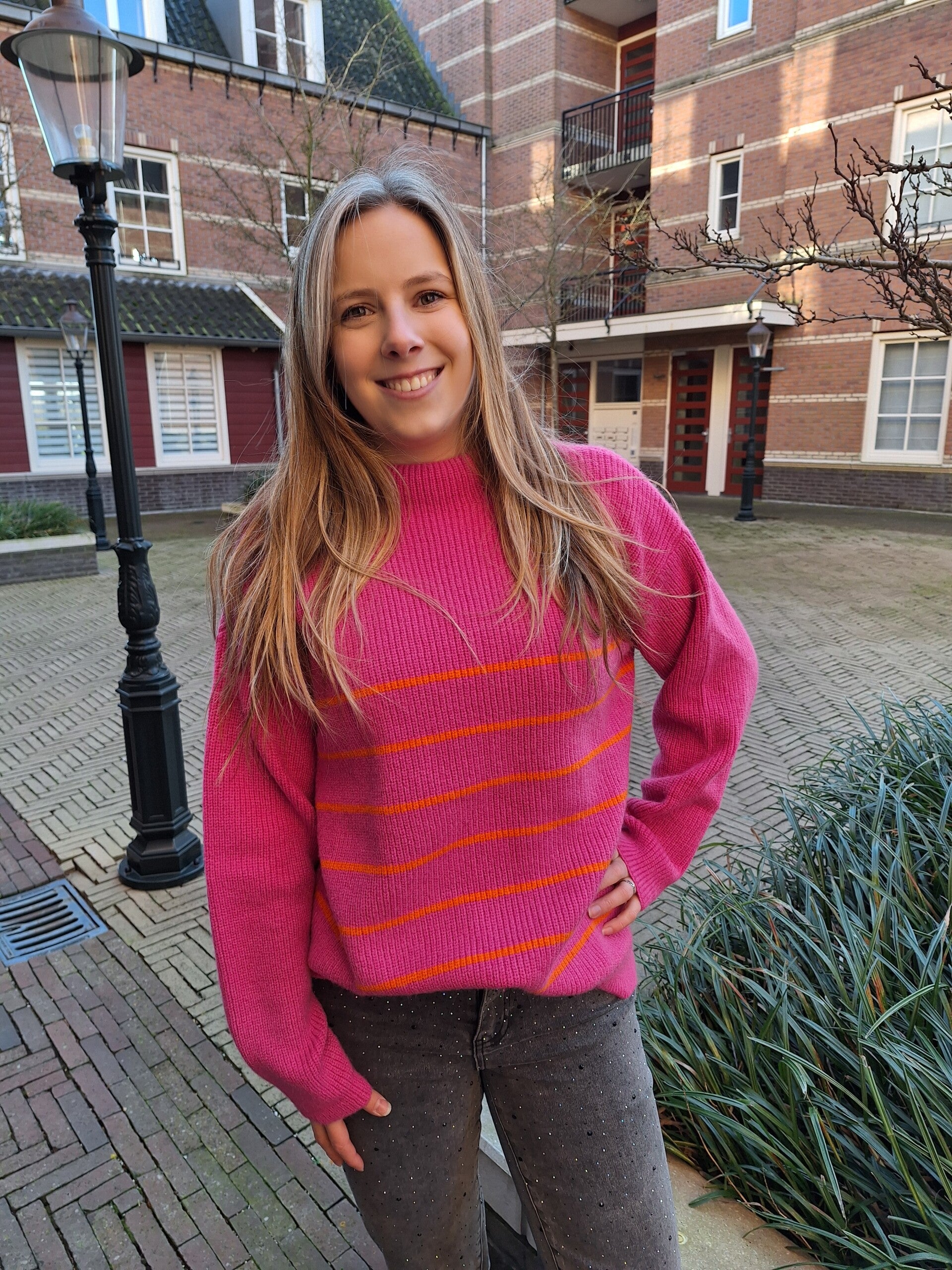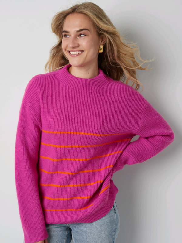 Ruimvallend truitje met streepjes. Valt wat langer en heeft leuke splitjes.