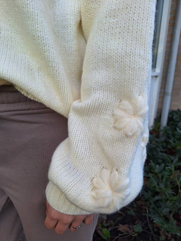 Leuke warme trui met bloemen op de mouwen. Bevat veel stretch en heeft ballonmouwen.
