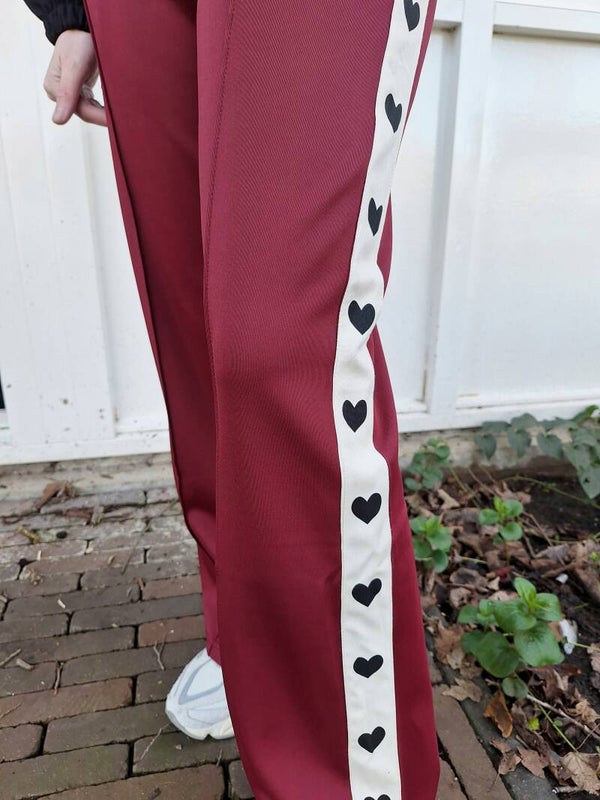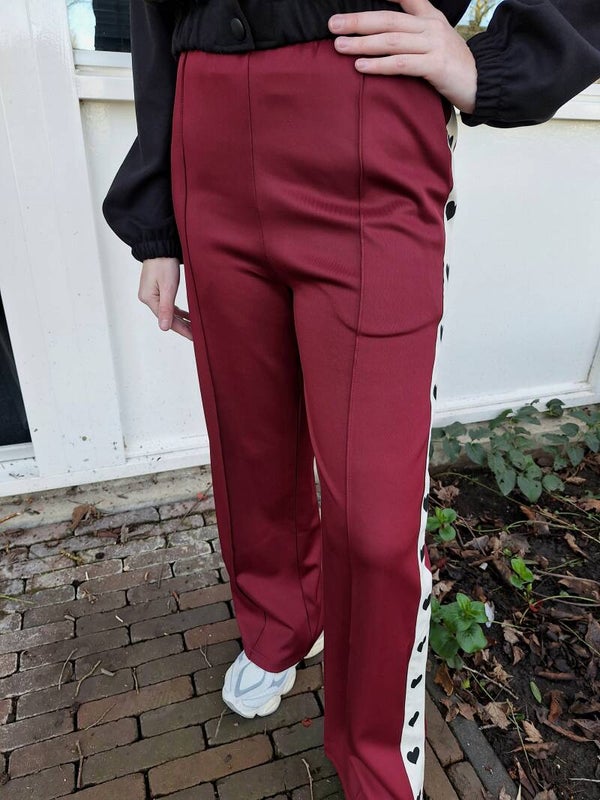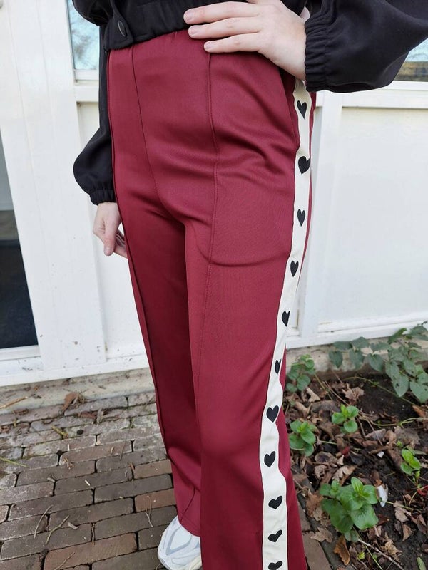 Lange broek met stijlvolle hartjes langs de zijkant voor een speels en romantisch accent. Comfortabel én trendy! Valt goed op maat.