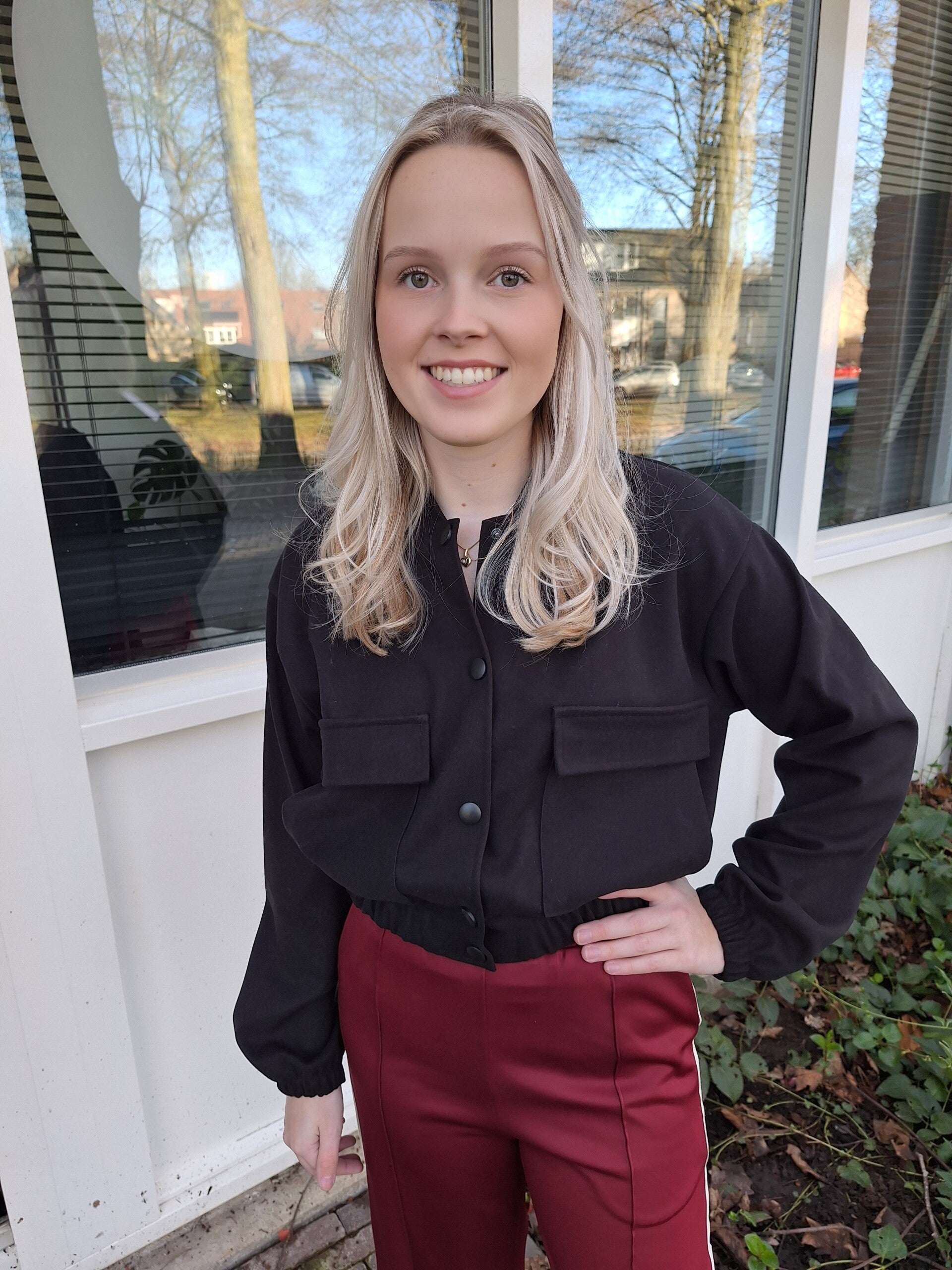 Kort bomberjack met drukknoopjes. Het jasje heeft zakken op de voorkant en elastiek op de heupen en bij de polsen.
