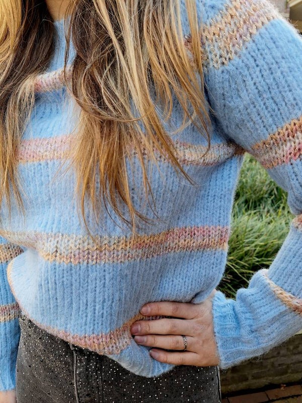Knaller voor het voorjaar! Heerlijk warm gebreid truitje met strepen. In de gemêleerde strepen zit óók nog eens goud lurexdraad verwerkt!