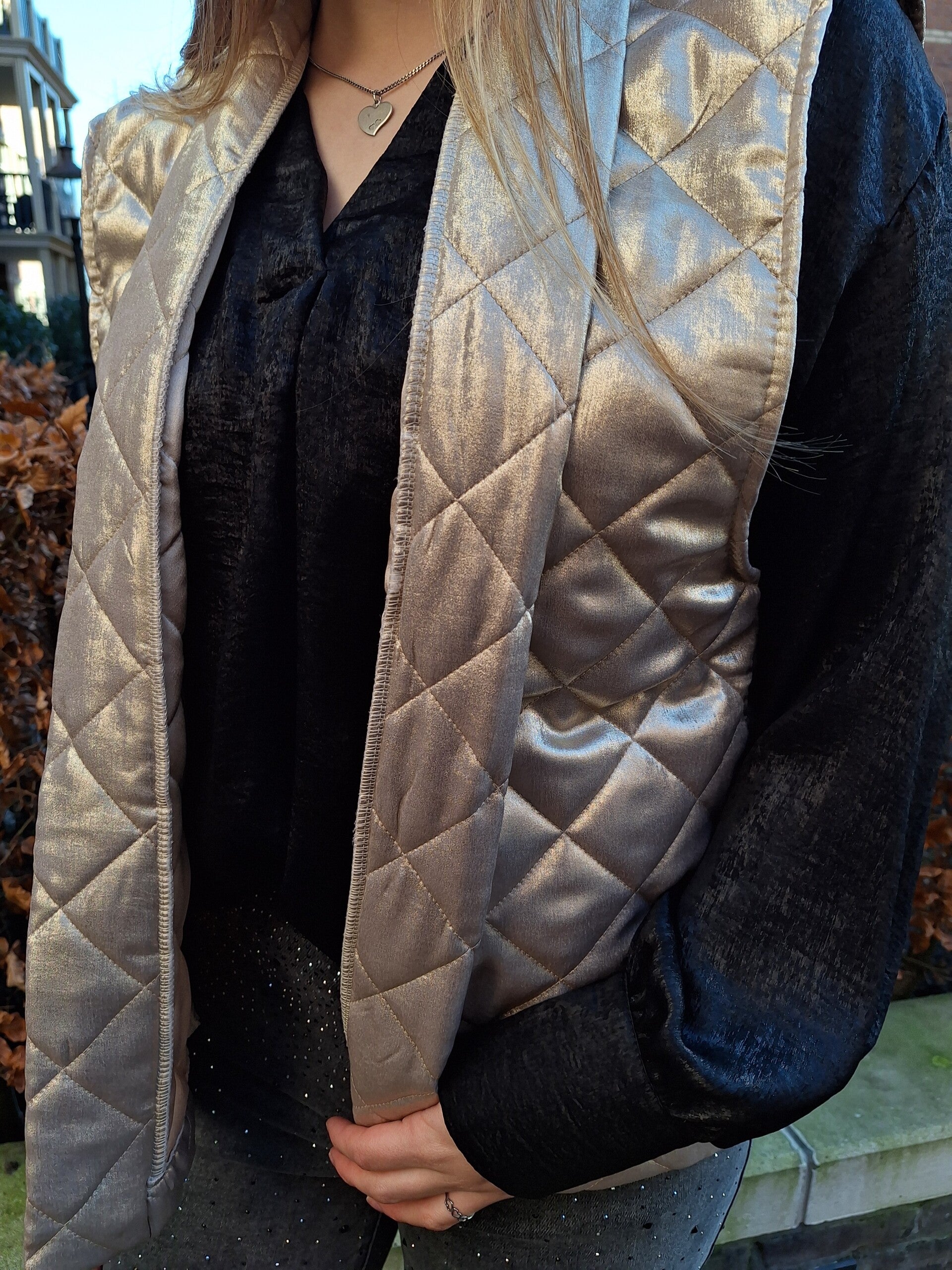 Gaaf metallic giletje in goud. Het gilet is leuk afgewerkt met een geruit stiksel.
