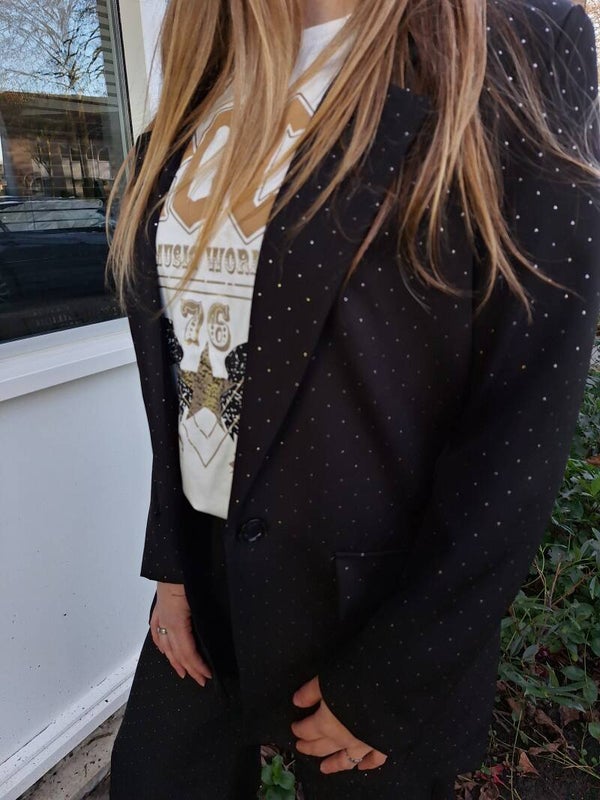 Wat eyecatcher! Dit pak heeft een mooie pantalon en een langere blazer, en zit vol met strass steentjes!