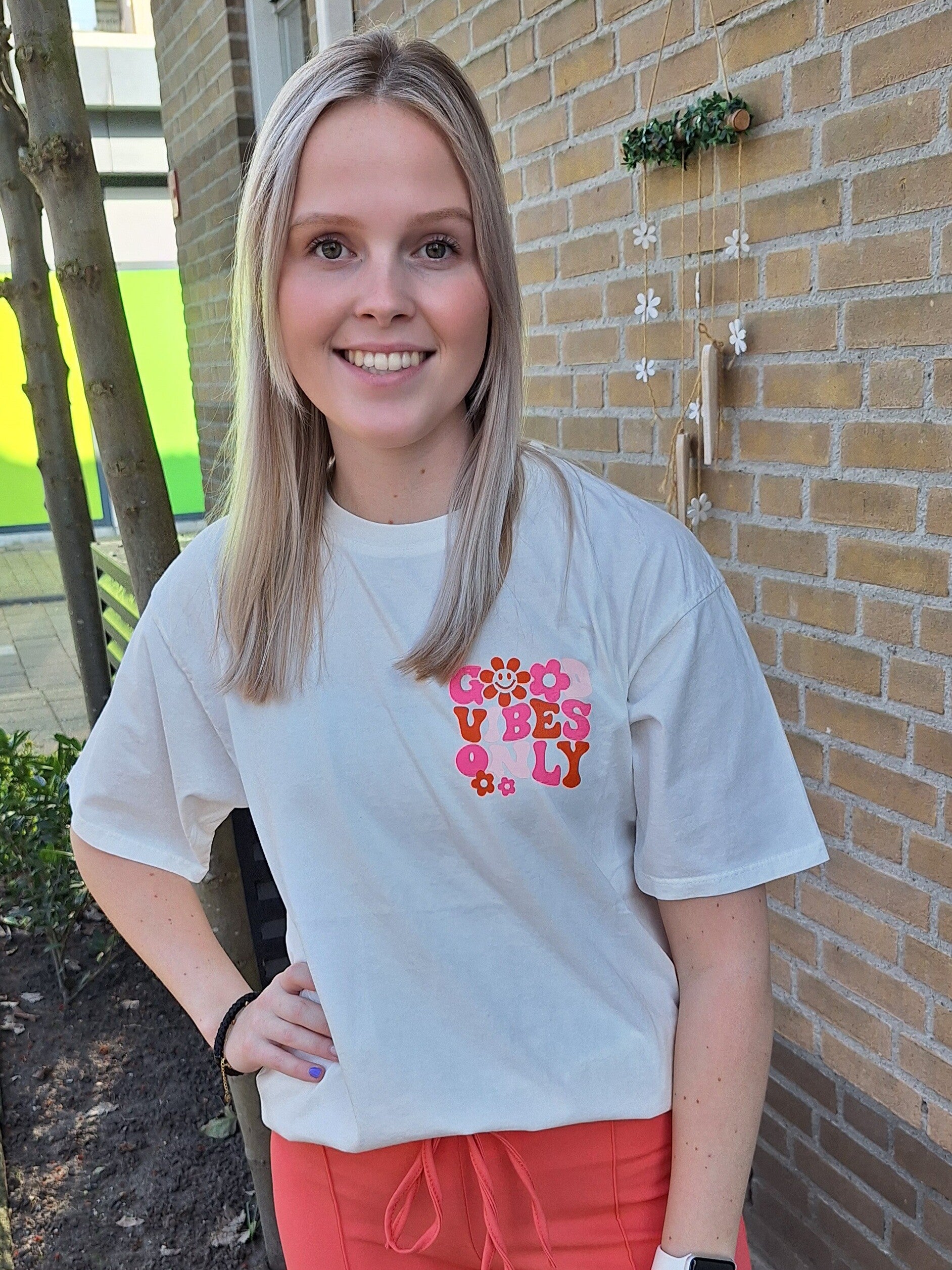 Good vibes only! Die trek je met dit te gekke t-shirtje natuurlijk wel aan! Het t-shirt heeft een kleine print op de borst en een grote op de rug, in de kleuren roze en oranje.