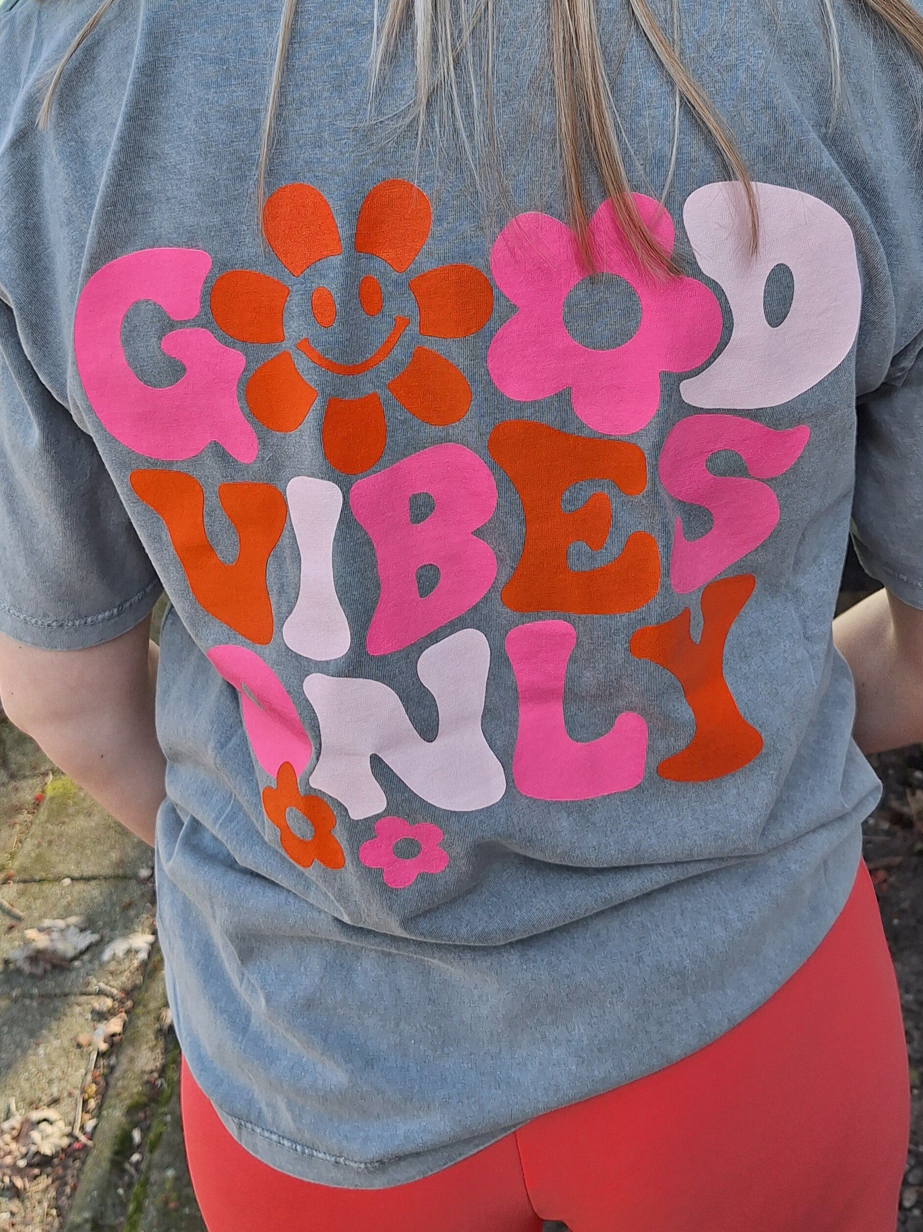 Good vibes only! Die trek je met dit te gekke t-shirtje natuurlijk wel aan! Het t-shirt heeft een kleine print op de borst en een grote op de rug, in de kleuren roze en oranje.