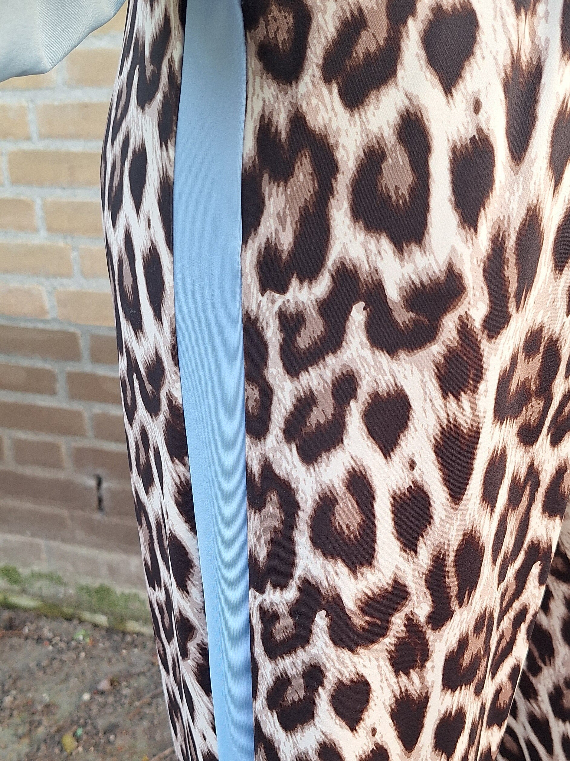Toffe travelstof broek in panterprint met vrolijk gekleurde bies. Valt wat langer, ons model is 1m68 en hangt bij haar echt op de grond!