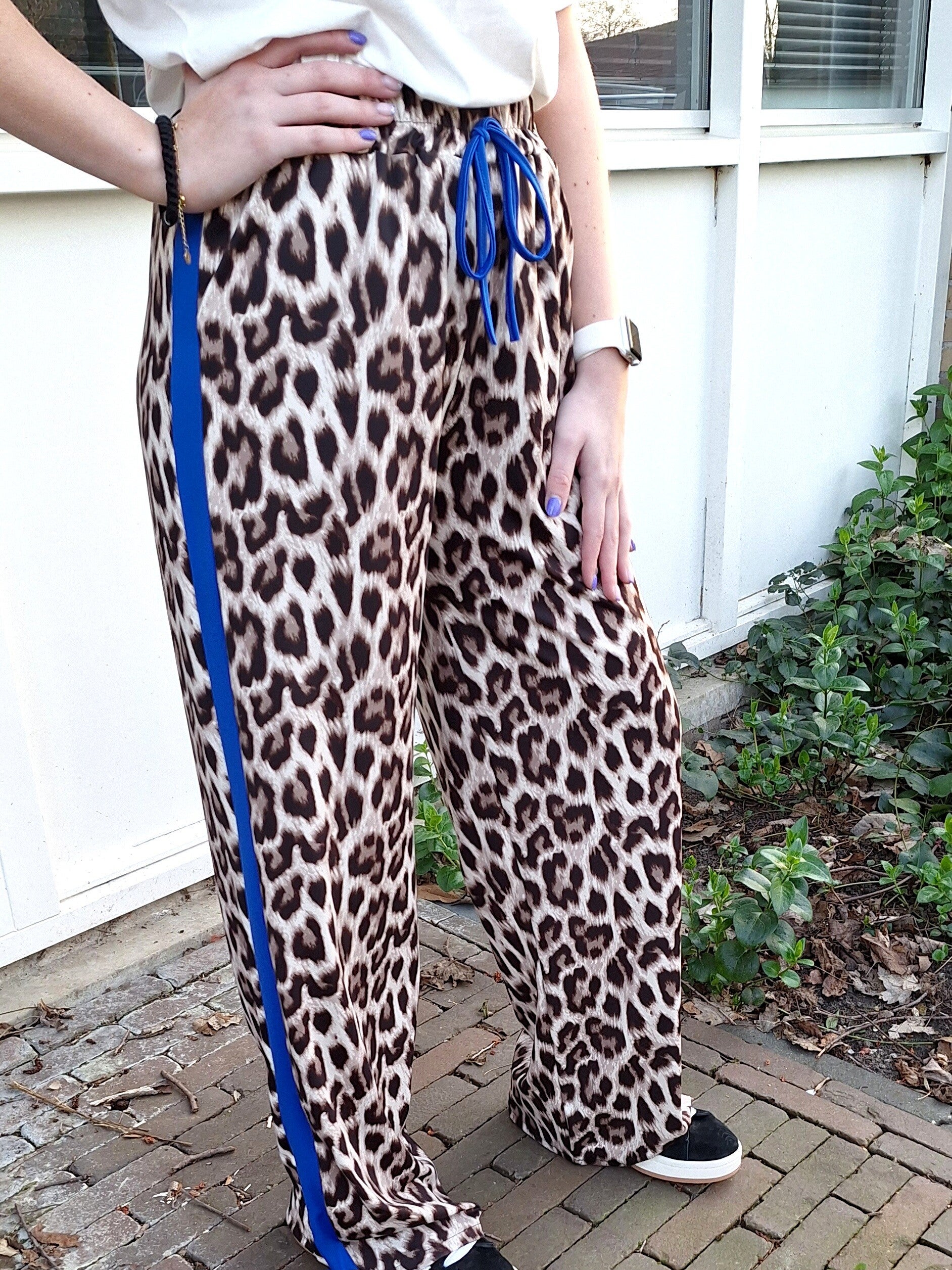 Toffe travelstof broek in panterprint met vrolijk gekleurde bies. Valt wat langer, ons model is 1m68 en hangt bij haar echt op de grond!