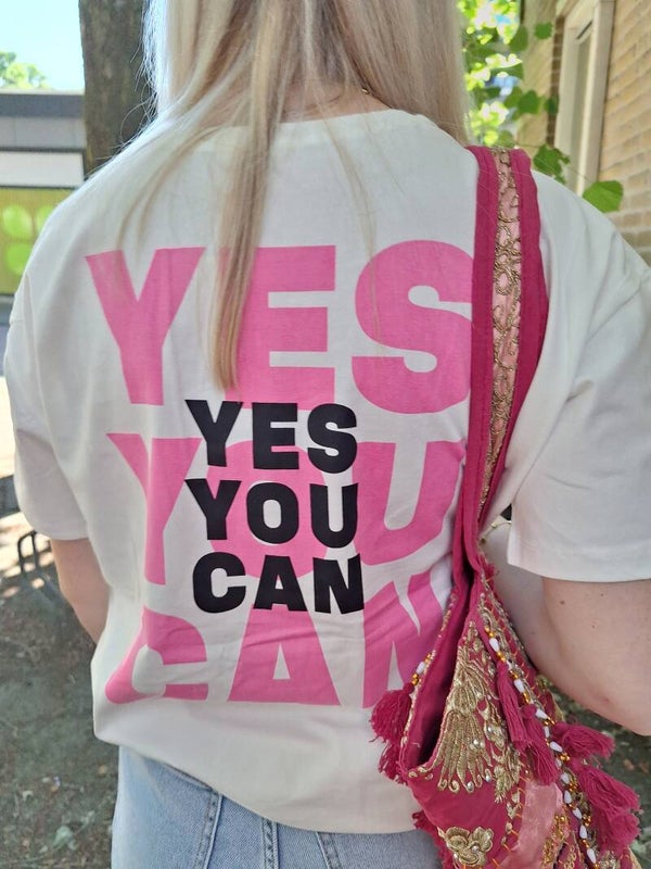 Leuk t-shirt met vrolijkgekleurde opdruk op de achterkant. De voorkant is leeg.