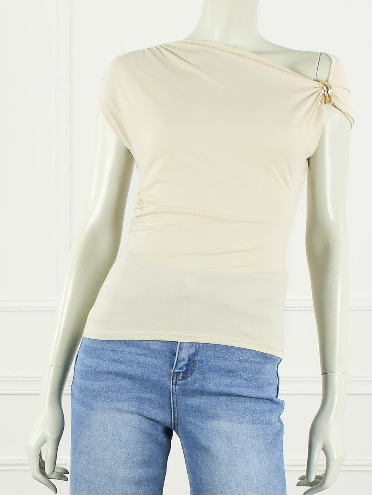 Chique one-shoulder top met gouden detail.