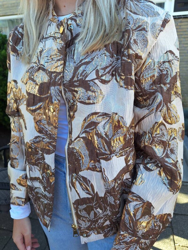 Mooi bomberjack met metallic brons bloemenpatroon. Het jasje sluit doormiddel van een rits en drukknoopjes en heeft twee steekzakken.