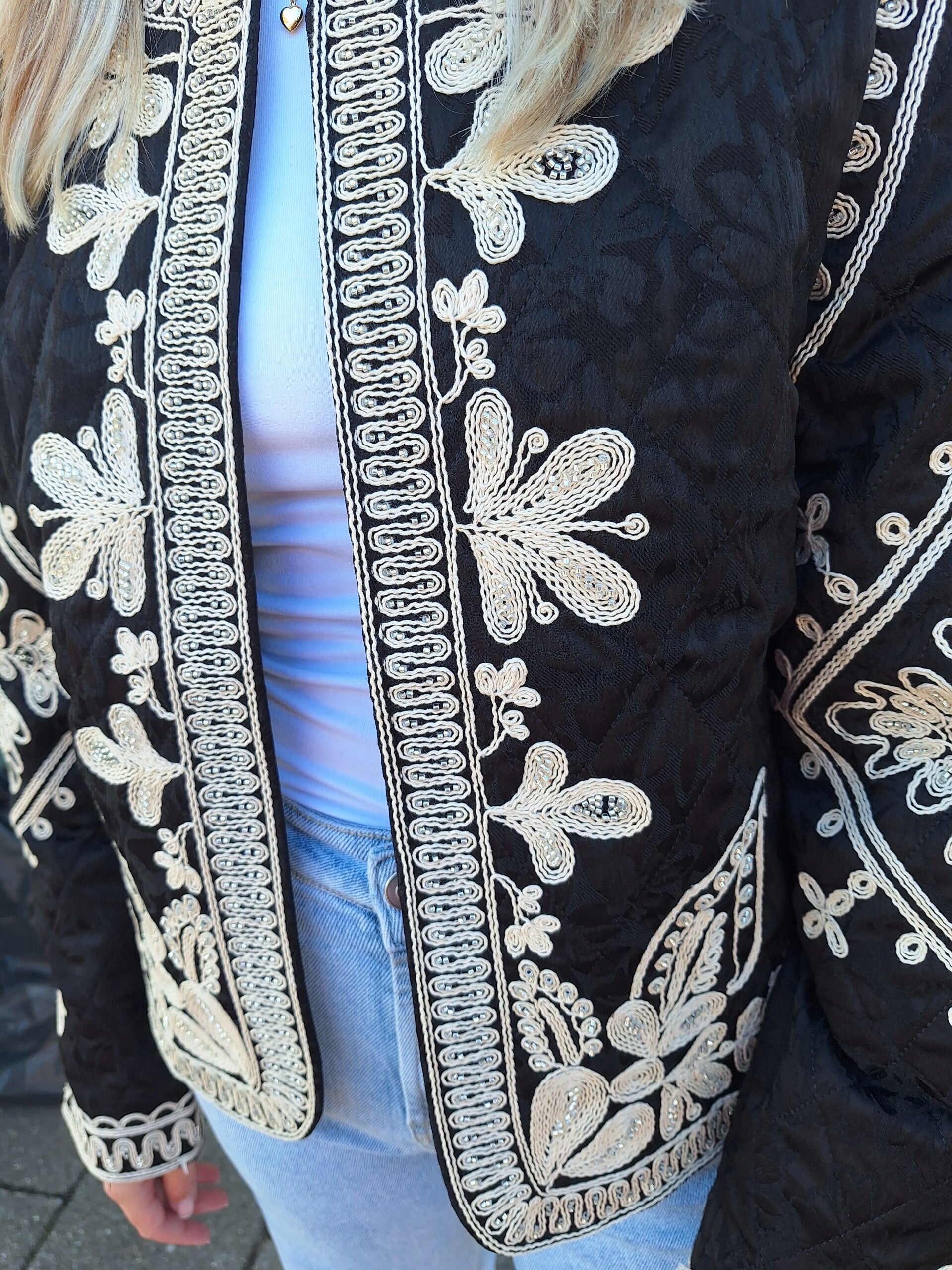 Prachtig jasje met ecru-kleurige borduursels!