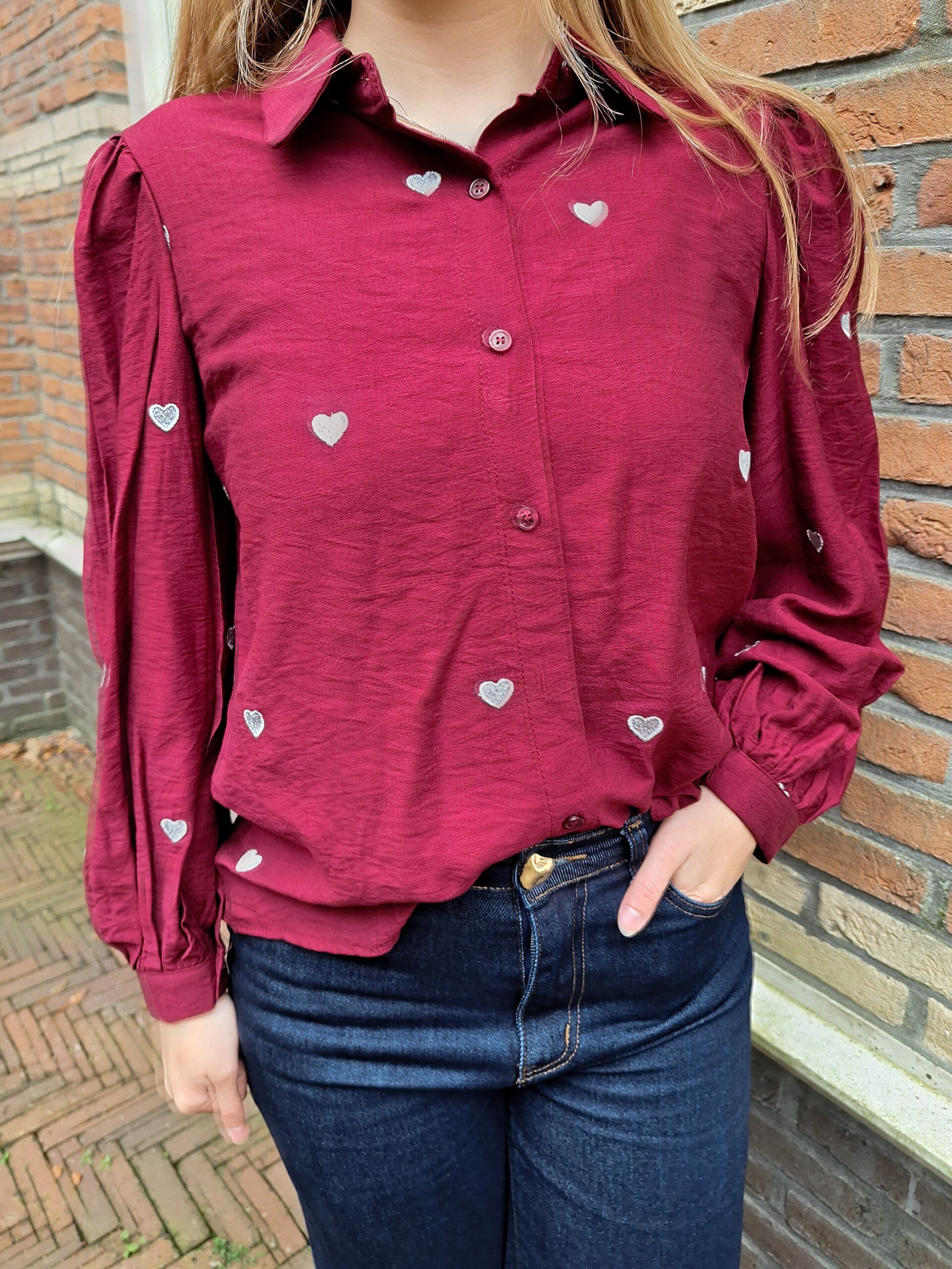 Leuke ruimvallende doorknoopblouse met ecru hartjes. Leuk om te knopen!
